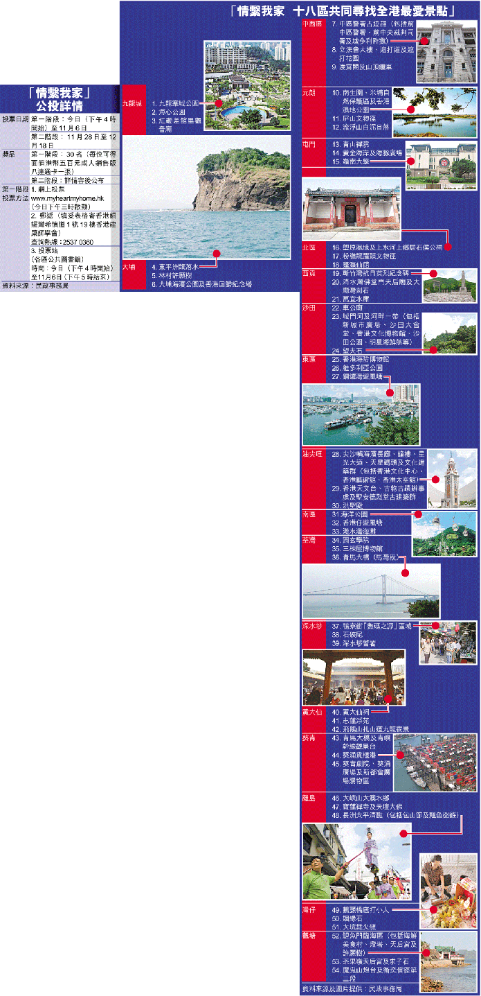 【本報訊】香港人終於享有公投,但不是選特首,而是選景點。民政事務局今日發起公投,號召全港市民一人一票普選屬於自己的深情景點。可以是渺無人煙的東平洲岩岸龍落水,可以是熱鬧喧嘩的遊行勝地維多利亞公園。公投今天開始,切勿錯失行使公民權利的機會。 記者:蔡元貴