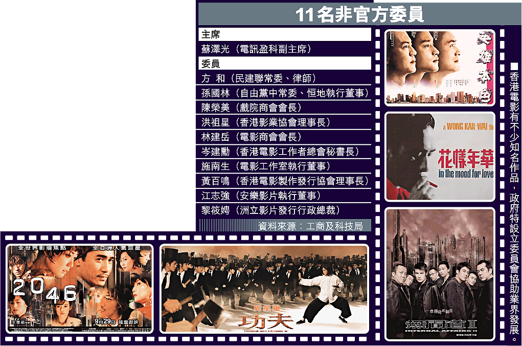 【本報訊】本年施政報告宣布設立電影發展委員會扶助香港電影業,港府昨公布十一名非官守委員名單,包括多名業內人士,兩大政黨民建聯及自由黨各有一名代表,主席為電訊盈科副主席蘇澤光,有立法會議員指蘇澤光缺乏電影業經驗,質疑其任命未必獲業界支持。