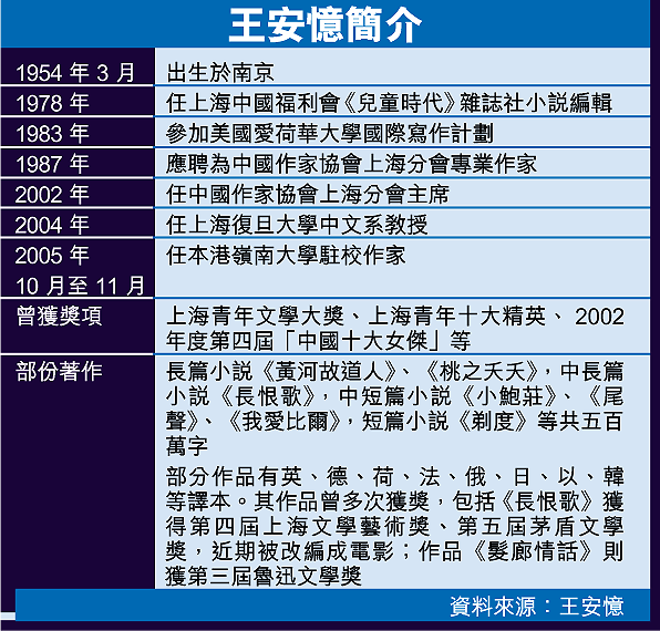 【記者梁美寶報道】改篇自中長篇小說《長恨歌》的電影,近日於本港上畫,並由藝人鄭秀文飾演女主角王琦瑤。小說作者王安憶前日由上海來港,獲嶺南大學中文系邀請任駐校作家一個月。她坦言熱愛寫作,打算一生都當作家,希望每次從作品中找到突破。