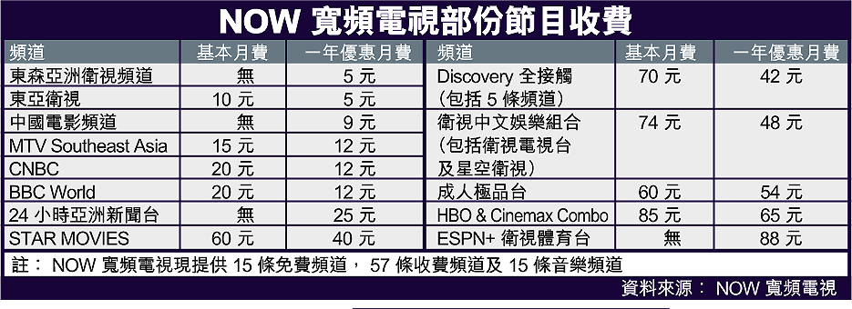 【本報訊】收費電視市場競爭再度升溫,李澤楷掌控的電訊盈科旗下NOW寬頻電視宣布,由即日起推出全新優惠計劃,新客戶只需選購其任何一條節目頻道,便可成為客戶。以NOW現時最便宜的頻道計算,客戶簽約十二個月,可以低至月費五元收看其節目(已包括15條免費頻道),並豁免服務安裝費及解碼器租機費,優惠期一個月。 記者:黃偉強