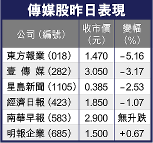 【本報訊】繼《太陽報》今日開始調低收費至3元,並同時贈送3元超級市場禮券;其姊妹報《東方日報》也由即日起贈送3元超級市場禮券。市場擔心本地報業減價戰再現,部份報業股股價昨明顯下跌,經營《太陽》及《東方》的東方報業(018)下跌5.16%,報1.47元;壹傳媒(282)跌3.17%,報3.05元(見表)。