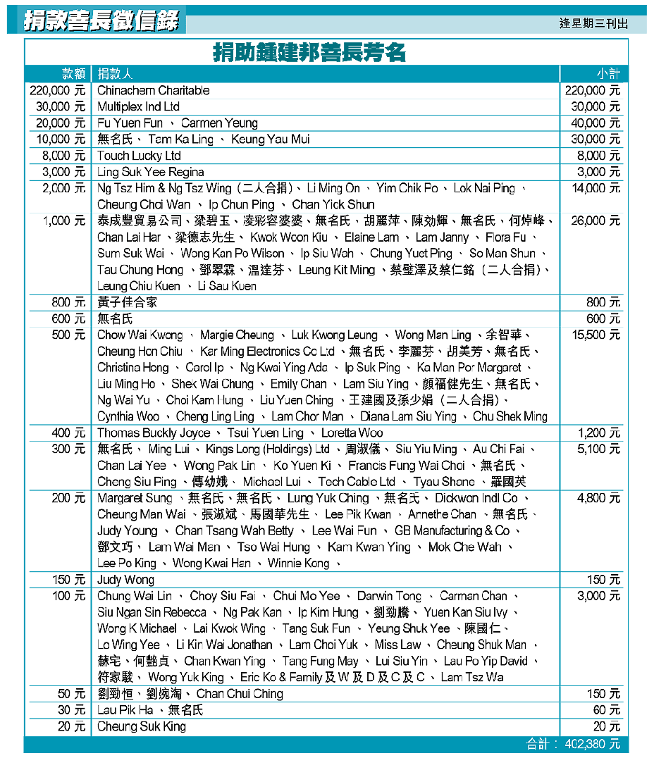 二十六歲淋巴癌青年鍾建邦,早前透過香港骨髓捐贈基金在英國覓得脗合骨髓,並成功進行移植。 是次手術化驗連同付運費用約需二十萬港元,蘋果日報慈善基金早前替他籌集捐助,至今合共收到四十萬二千餘元,扣除手術費後,善款會用作支付阿邦康復期間所需醫療開支,包括部份需自費使用的抗排斥藥物及檢查費用等。 捐款編號:C1712