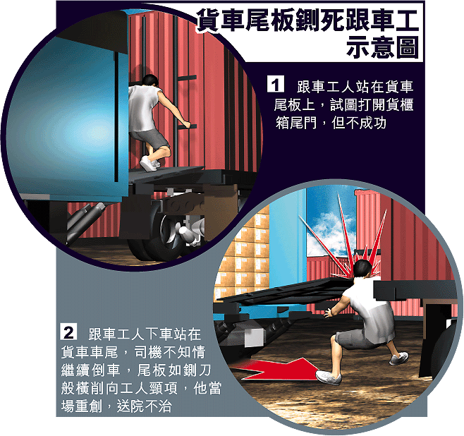 【本報訊】新界打鼓嶺一個貨櫃場昨日發生罕見奪命意外,一輛貨車開啟尾板倒車準備連接貨櫃箱落貨時,懷疑程序出錯,以及司機與跟車工人缺乏溝通,引發意外。事發時,年僅十八歲跟車工人突然下車並站在車尾位置,司機在不知情下繼續倒車,結果貨車尾板如鍘刀般橫削工人頸部,工人當場重創倒地,頸項鮮血淋漓,司機下車發現立即報警,惟送院終告不治,警方及勞工處正調查意外原因。 記者:陳天華、梁瑞帆、馮志偉