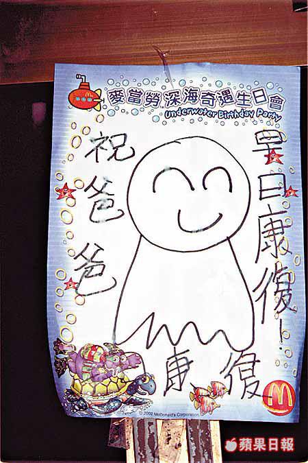 記者所見,屋內窗門貼了一幅畫,寫着:「祝爸爸早日康復」,另家中亦擺放了一瓶幸運星,郭太說這是子女特別送給父親,希望他抖擻精神,勇抗癌魔。