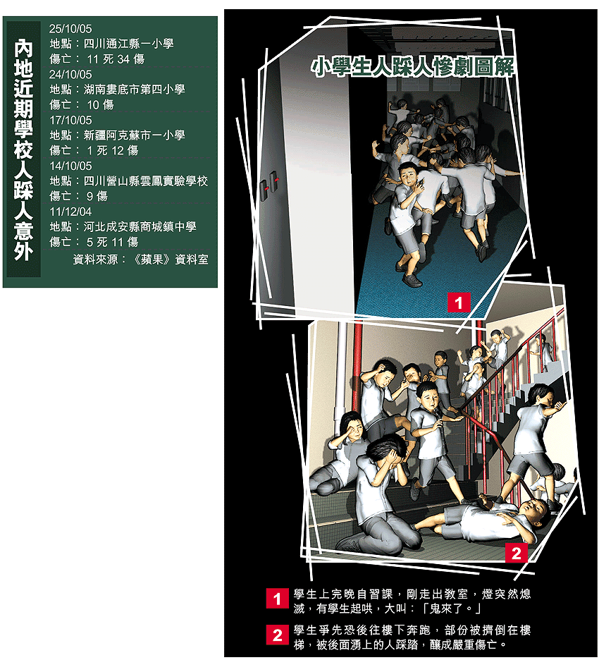 「鬼來了﹗」想不到一句戲語,竟釀成一宗學校人踩人慘劇。四川省通江縣一間小學的學生前晚上完自習課後,電燈突然熄滅,有人大喊有鬼,嚇得大批學生湧向樓下,以致不少學生跌倒及遭踐踏。意外共造成十一人死亡,二十七人輕傷、七人重傷。據悉,該校一名學生曾於事發前一周在校內服農藥自殺身亡,因此加劇學生對鬧鬼的恐懼。