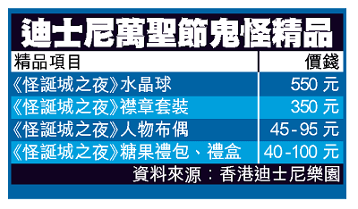【本報訊】萬聖節臨近,預示嘩鬼出動的日子到了,香港迪士尼樂園今年將以廣受歡迎的驚悚喜劇《怪誕城之夜》作主題,推出一系列包括骷髏阿Jack等電影主人翁的萬聖節精品。而銅鑼灣時代廣場則會出現九隻大頭嘩鬼,向路經的小朋友大派糖果。