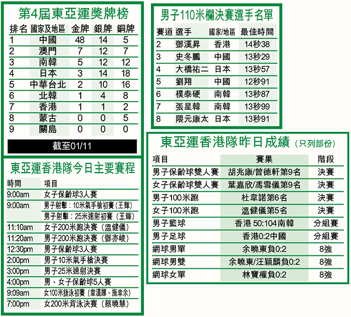 今屆東亞運會重頭戲碼男子百一米欄決賽將於今早上演,這面金牌雖早被視為「欄王」劉翔的囊中物,不過另一中國名將史冬鵬亦虎視眈眈,何況劉翔賽前表示不介意「當老二」;究竟「東亞欄王」最終誰屬?同日,香港二百米跑紀錄保持者鄧亦峻出賽,為港爭取首枚田徑獎牌。記者:徐嘉華、黃賢創、黃冠華澳門直擊