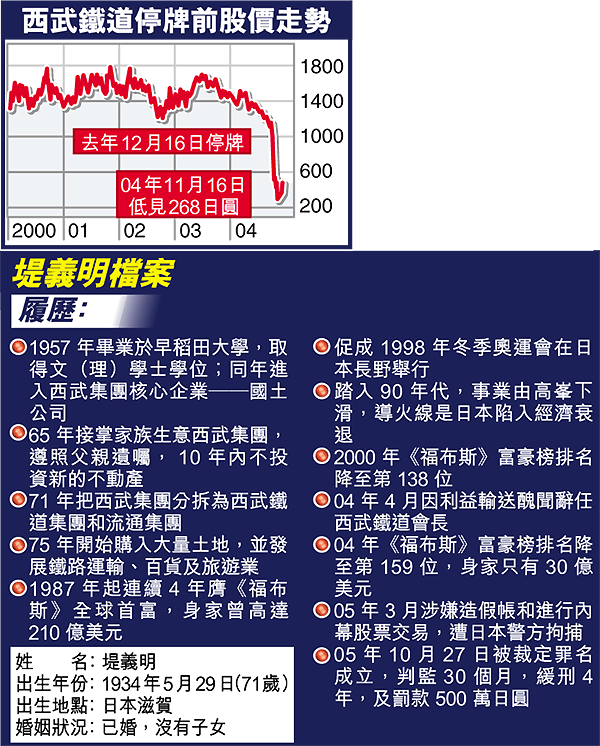 堤義明去年被告上法庭前是西武集團(Seibu)會長,主要罪狀是:指示助手在旗下西武鐵道公司(SeibuRailway)2003年財務報表中,隱瞞國土公司(Kokudo)是西武鐵道的最大股東身份。