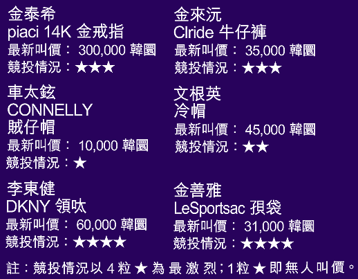 所有拍賣物件以底價的一萬韓圜(約七十四港元)開始,每次叫價不設限,即叫高一元亦可。雖然拍賣昨日才正式展開,但直至昨日傍晚時分,部份物品已超出底價好幾倍,當中以金泰希的14K金戒指叫價最高,比底價高出近三十倍,最新叫價為三十萬韓圜,即約二千二百港元。