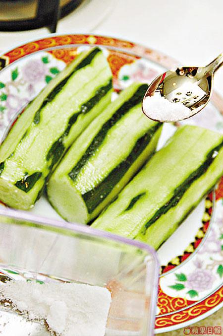 青瓜水份重,事先用鹽醃30分鐘,可減青瓜水份,令沙律不會水汪汪。