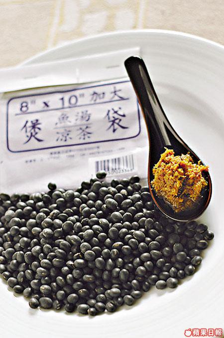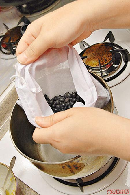 1.黑豆浸4小時,放進煲魚袋內縛好,放進1.5公升熱水,慢火煲45分鐘。
