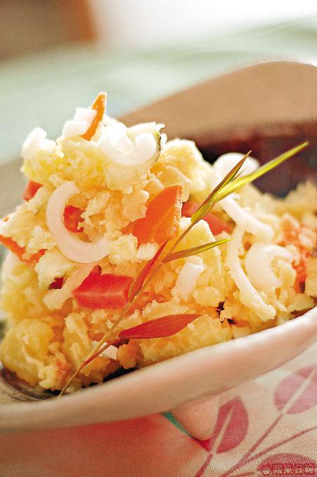 Sue:要整好味薯仔沙律,最重要將它整成半茸半粒,每粒約1吋,食時更有口感;配合青瓜、洋葱、甘笋、火腿,五款食材口感豐富。雖則薯仔飽肚,熱量卻比白飯少,每100克白飯約111卡路里,薯仔則97卡路里。