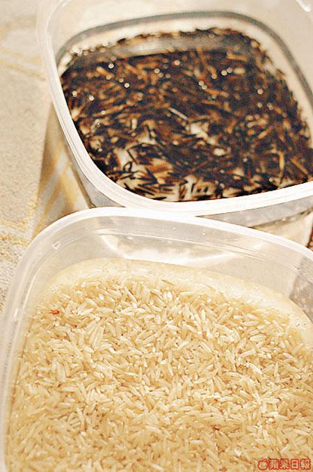 2.加2公升水於電飯煲內,再倒進糙米及野米煲。