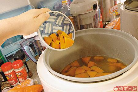 南瓜不宜煲太爛,所以要在後期加入,保留南瓜粒粒口感。