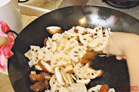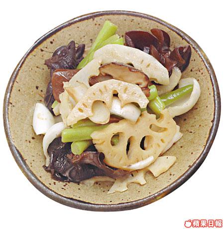 Sue:蓮藕含豐富蛋白質、纖維、維他命C等;木耳也高纖,蛋白質豐富。炒時滴油不用,非常健康。