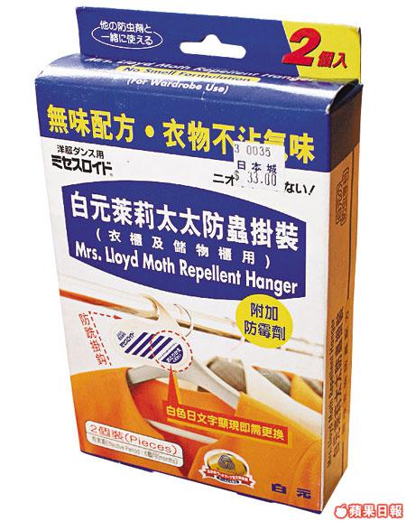 樟腦丸的氣味相信大家近日把冬季衫拿出來時已領教過,氣味攻鼻難聞之餘亦長留在衣服上久久不散,真的很難受呢!稍後當大家收埋夏天衫的時候,不如買一些無味的防蟲劑。例如象球牌絲紗防蟲片無味無臭,與樟腦丸的功效相同,除了普通衣物之外,也可用於塑膠、羊毛、皮裘及皮革等質料衣物,它備有更換顯示,當紅色顯示轉為白色,即代表是時候更換。另一款白元萊莉太太防蟲掛裝,則方便掛於衣櫃內,同樣有更換顯示,一盒有兩個,有效期長達六個月。