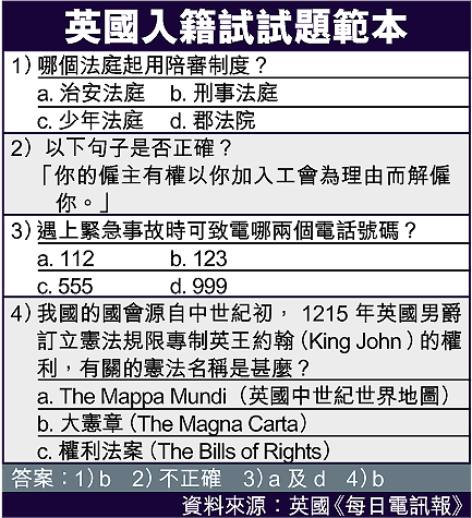 新移民要入籍英國,可謂「過三關斬六將」。昨天起,英國政府規定新移民要考取公民試(俗稱「入籍試」),二十四條選擇題中答對四分三,即十八條,才可獲發英國護照。但部份試題既深且難,連土生土長的英國人也說難答,實在考起初到貴境的新移民。