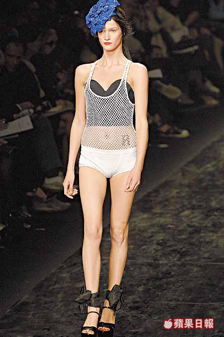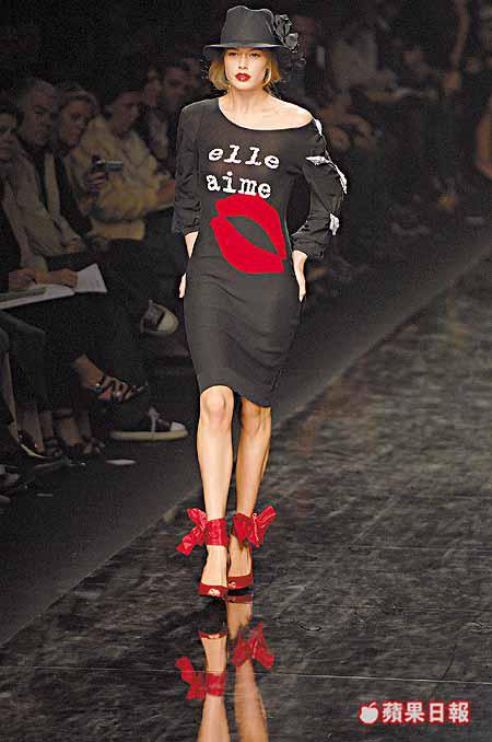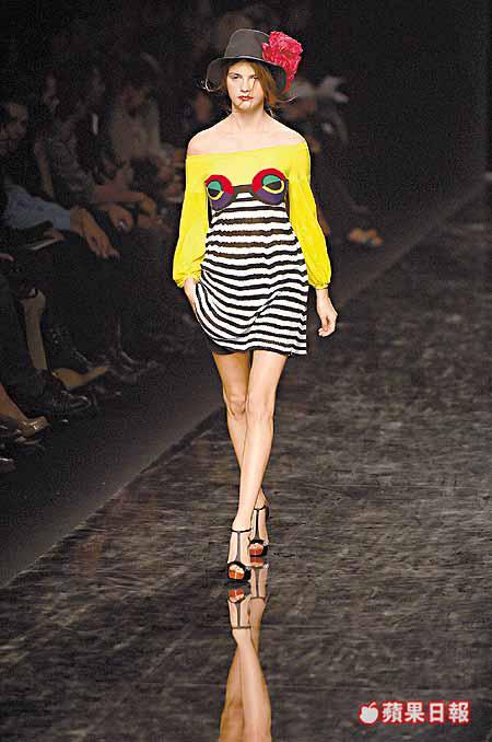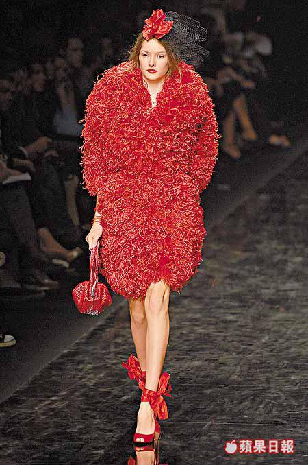 項目計有綴以大蝴蝶結的黑白斑馬紋裙子、外罩喱士的blackdress、烈火紅色fauxfurcoat、豔麗桃紅halterdress、胸前飾有眼睛圖案的針織條子裙、腰間為魚網details的泳裝等。