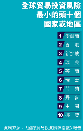 愛爾蘭風險最小排榜首;香港屈居亞軍。然而在風險最細十個國家(或地區)中,除中國外,全部屬高收入國家或地區。研究中心主任季鑄認為,中國入十大是意料之外,顯示中國積極改革開放,專心發展經濟已初見成果。