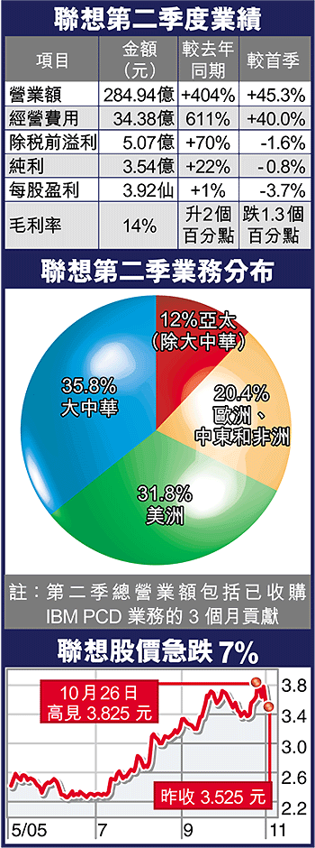 聯想集團(992)收購IBM個人電腦業務的影響,全面反映於第二季業績,加上新興市場業務增長,令純利升22%至3.54億;但較首季度則微跌0.8%。另派中期息2.4仙。美國戴爾發盈警,聯想股價昨急挫7%,收報3.525元。