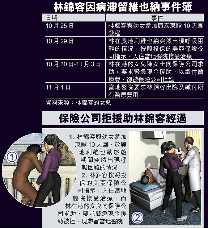 六十三歲的陳林錦容與幼女上月參加康泰十天東歐團,並透過旅行社向美亞保險公司(AIU)購買一份旅遊保險。旅行團上月二十五日出發,原定本月二日返港。林女士上月二十九日,在奧地利維也納遊覽時感到呼吸困難,領隊當晚安排私家醫生替她治理,並將事件通知美亞,並按其指令入住當地醫院。