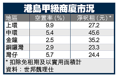 世邦魏理仕大中華區環球研究部助理董事黃秀銓表示,灣仔區甲級商廈今年首3季租金升37%,扣除免租期的實用面積呎租24.4元(較面租低4至5元),與銅鑼灣相若,較中環區低近一半。除太古廣場第3座外,現時港島只有鰂魚涌和上環也有較大樓面商廈招租,估計明年甲級寫字樓租金升20%。