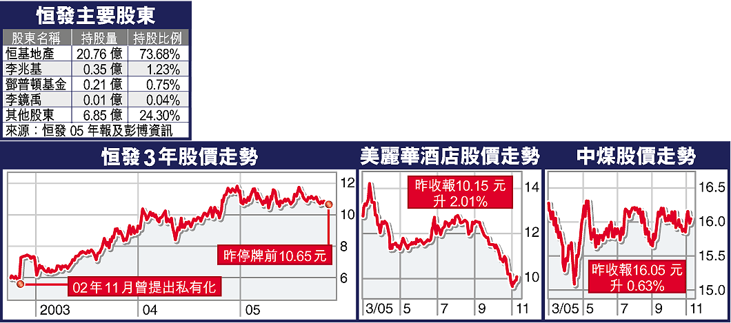恒發除較早前成功私有化恒基數碼(8023)外,現仍持有39%中華煤氣(003)、44%美麗華酒店(071)及31%香港小輪(050)。除小輪無升跌外,中煤及美麗華分別升0.63%及2.01%,收16.05元及10.15元。