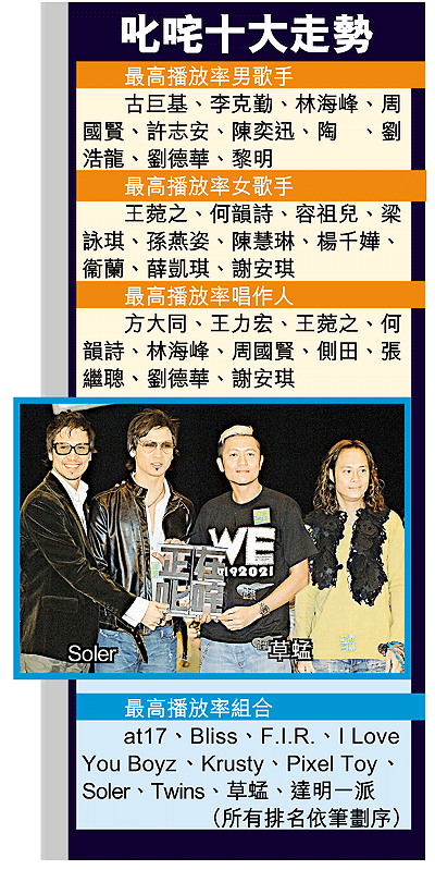 陳奕迅(Eason)、鄭中基(Ronald)、古巨基、楊千嬅、Twins、草蜢和何韻詩等,昨日於九龍灣展貿舉行的「叱咤樂壇流行榜頒獎典禮」記者會,大會並即場公布以播放率計算的「叱咤十大」走勢(見附表)。由於商台今年以手機短訊分兩輪投票的方式選出「我最喜愛的男、女歌手、組合」,故一眾歌手亦即席選出心目中最喜愛的歌手,結果由Eason得到「我最喜愛的男歌手」,雖然林憶蓮沒有出席記者會,但仍勇奪「我最喜愛的女歌手」,而「我最喜愛的組合」則由草蜢及Soler奪得。