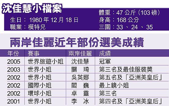 不過,在世界小姐、環球小姐、國際小姐三大選美賽事中,台海兩岸佳麗的最佳成績仍然只是季軍(見表)。她們屢屢與冠軍、亞軍擦身而過,給人所獲獎項是安慰多於實力的感慨。 本報記者