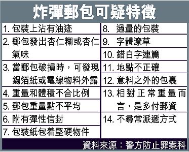 【本報訊】郵包或包裹炸彈在九十年代頗為流行,不但傷及事主,亦禍及無辜,幸近年該類事件比較少見。警方指,其實郵包內是否藏有炸彈是有迹可尋的,只要留意一些可疑特徵便能避過禍劫。