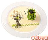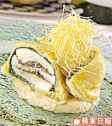 蘆笋綑成一紮在裏面包入餡料,更將不同顏色的醬汁,用黑(墨魚汁)、綠(菠菜)、橙(甘笋汁)、米(忌廉汁)色等,繪成一幅美麗的圖畫。