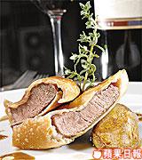 嫩滑的羊柳被酥皮包裹再烤,令羊柳充滿肉汁,而外皮則很酥脆,配上比利時土產啤酒配特產苦心菜,味道更香。