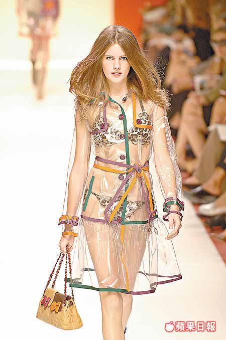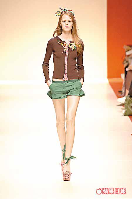 服裝當然是離不開一股調皮女孩風格,小碎花裙、間條jacket配小圓點褲;animalprintdress、碎花結合格仔圖案、飾上彩色鈕釦的satinpants、studdcroppedjeans;燈籠袖水手top、腰果花blouse、綴有寶石的泳裝、超大心形trenchcoat及透明雨衣,還有用到盡的蝴蝶結,放於領口、腰間及裙腳等等款式,你說得出、想得到的都有,完全是個味美joyful的自娛collection。