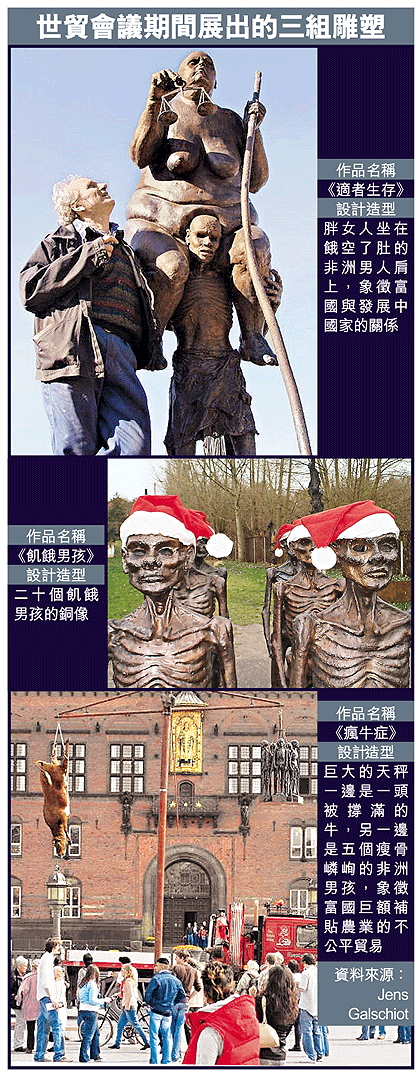 【本報訊】下月世貿組織部長級會議期間,市民將可以看到一頭牛屍被吊起,掛在天秤的一端,另一端是五個瘦骨嶙峋的非洲男孩。創作《國殤之柱》的丹麥藝術家高志活(JensGalschiot)三組有關世界貿易的雕塑群,將於下月初運抵本港,準備在世貿會議期間展出及參與遊行。