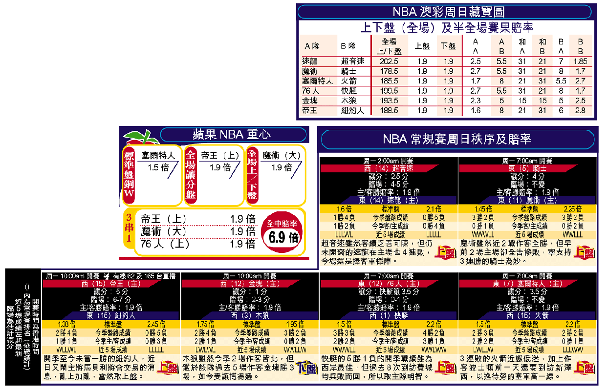 開季至今五戰全敗的紐約人周一將作客薩克拉門托帝王,預料現正受內憂外患打擊的紐約人,就算臨場受讓六至七分,也難以打響勝鼓,還是捧主隊為上。(有線62及165台明日10:00am直播)