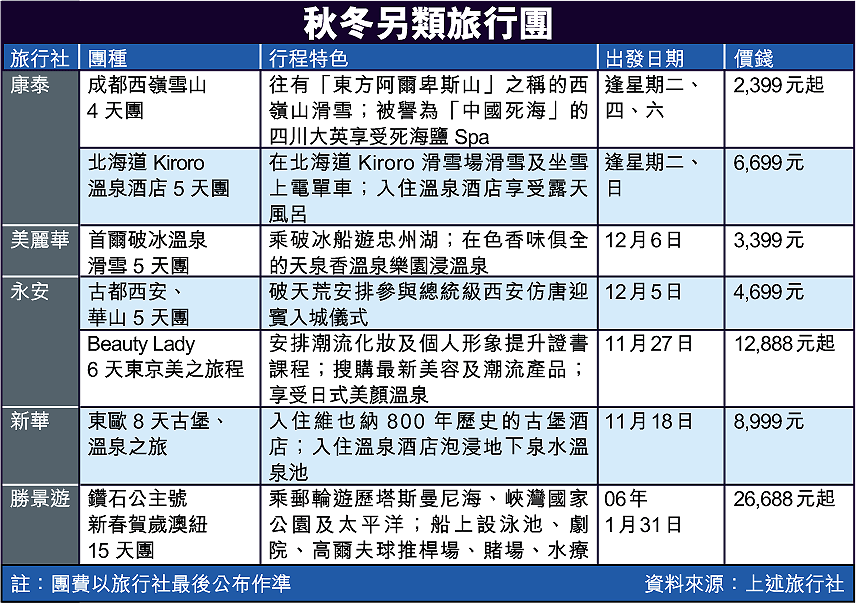 【本報訊】外遊經驗豐富的港人參加旅行團愈見刁鑽,旅行社為滿足旅客的要求,在今個秋冬紛紛推出另類特色團:辦公室女郎可選擇到東京學習潮流化妝、愛享受一族可躺卧在有「中國死海」之稱的四川大英歎死海鹽水療、再豪一點可乘坐造價四十億元的鑽石公主號遊覽澳紐。 記者:蔡朗清
