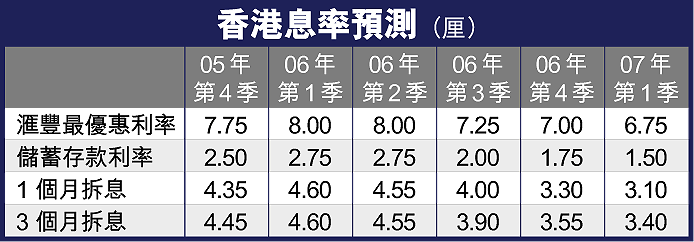 滙豐的預測對港去向有啟示;滙豐銀行大中華區首席經濟師梁兆基接受記者查詢時預期,本港最優惠利率在明年首季升至8厘後見頂,因應美息走勢預測,最優惠利率明年第3季會減至7.25厘,並於07年首季降至6.75厘。