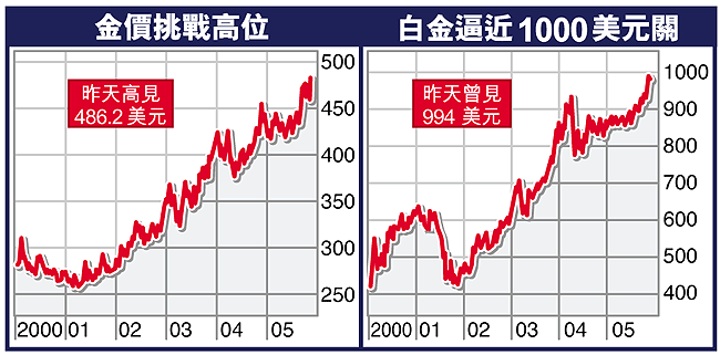 隨着基金繼續追捧貴金屬,國際現貨金無視美滙強勢等不利因素,昨天直撲每盎斯490美元,創近18年來最高價;白金價格更一度逼近每盎斯1000美元關,攀上26年來高峯。