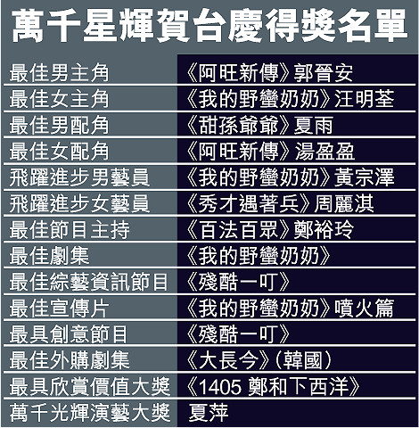 【本報訊】無綫《萬千星輝賀台慶》昨晚在將軍澳舉行,賽前鬧得滿城風雨的最佳女主角獎項,最終由大熱門《我的野蠻奶奶》的汪明荃奪得,最佳男主角則為《阿旺新傳》的郭晉安,而二人更是第二度獲得男、女主角殊榮。 記者:卓寶花、卓美娟、王崇穎