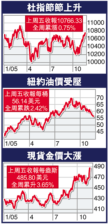 美國杜瓊斯工業平均指數連升4周,直撲10800點關口,攀上8個月高峯。過去4星期,美股市值增加接近8700億美元,幾乎相當於澳洲與波蘭全年經濟產值(GDP)的總和。證券分析員估計,隨着資金湧入科技股,加上原油價格回落至5個月低位,美股本周有力再升。
