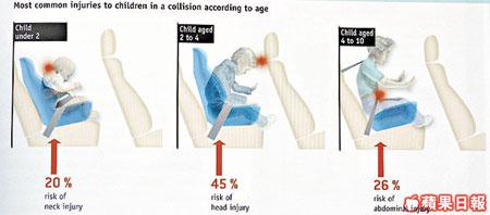 腹部受傷最常見,小朋友的盆骨未完全發育,他們不能像大人一樣,可以透過安全帶輕易牢固於盆骨之上。安全帶於撞擊時會移向腹部擠壓造成傷害,所以須用兒童椅墊,這樣安全帶就能牢固於胳膊及盆骨上。