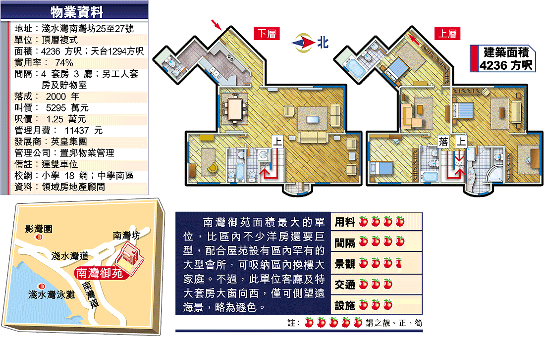 南灣御苑頂層複式大戶,設4房3廳,各房間均為套房設計,包括佔上層近半樓面的特大套房,估計總面積超過800方呎,除寢區外,尚有偏廳及自成一隅的工作區,當然少不了間隔寬敞,內有大型按摩浴缸的豪華浴室。至於下層焦點非客廳莫屬,設有兩組曲尺大窗,間隔上可細分為主廳及偏廳,合共至少1000方呎。