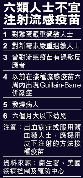 衞生署今年擴大流感疫苗注射範圍,將懷孕四個月以上和六至二十三個月幼兒納入建議注射行列,連同院舍員工、六十五歲以上長者和家禽從業員等八類合資格人士,預料可為二十五萬人注射,較去年多五萬人。根據衞生署資料,六類人士不適宜注射流感疫苗(見表)。