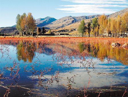 紅草地就在離稻城二十多公里外桑堆鎮,每年只讓初秋的豔陽金風把她染得一抹嫣紅,水波掩映,半倚天邊的一襲晚霞,這短短二十來天的絢麗;若讓她輕易的在你身邊溜走,天涯夢遠,不知何日有緣再度重逢。