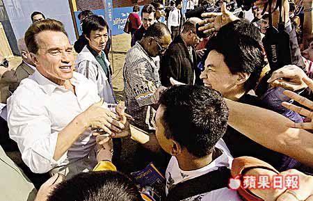 【本報訊】曾飾演「未來戰士」的美國加州州長阿諾舒華辛力加昨日駕臨維園,推廣加州農產品,呼籲家長多鼓勵子女吃生果及蔬菜,吸引約三百人一睹這位「戰士」風采。不少人都爭着與他握手及索取簽名,阿諾引用「未來戰士」的經典名句「I'llbeback」(我定會回來),引來全場一片掌聲。