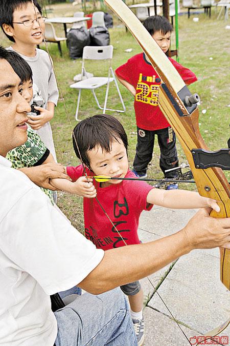 怕水唔想扒艇的話,亦可轉戰射箭場,雖然在旁有哥哥協助拉弓,但要射中箭靶都幾考眼界,唔好以為年紀大的一定好眼力,在射箭大比拼中,年紀最小的靜霖居然一箭中紅心勝出。