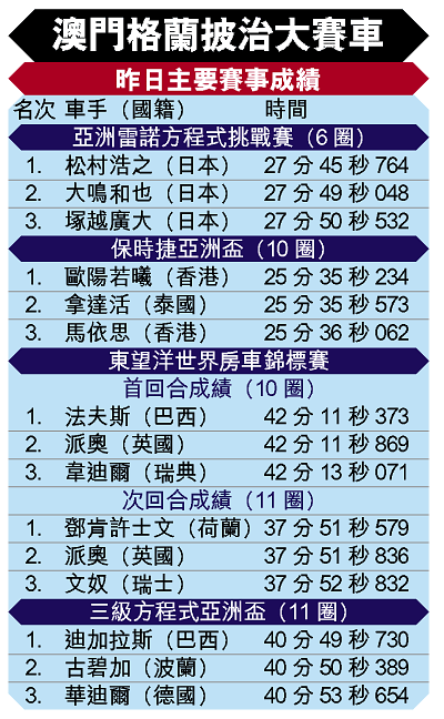 第五十二屆澳門格蘭披治大賽,昨日在意外頻生情況下曲終人散。全日重頭戲東望洋FIA世界房車賽,英國車手派奧連奪兩回合亞軍,這成績除了讓他有足夠分數登上世界冠軍外,更重要是協助寶馬(BMW)擊敗愛快(Alfa),奪得全年最佳車隊榮譽。