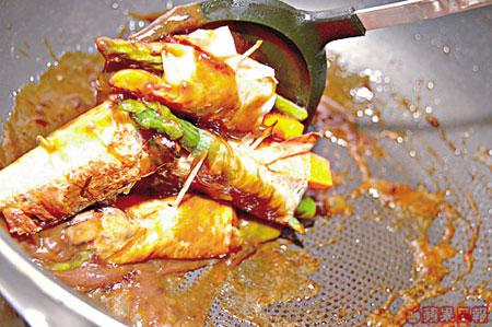 B將現成的酸甜汁煮熱,以腐皮卷蘸醬吃。