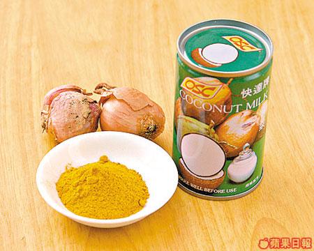 自己混醬:乾葱2粒、咖喱粉5湯匙、椰汁3湯匙、蒜頭1個