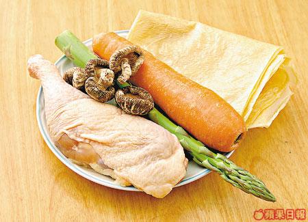 雞髀1隻、腐皮1塊、冬菇4隻、紅蘿蔔半條、蘆笋1條